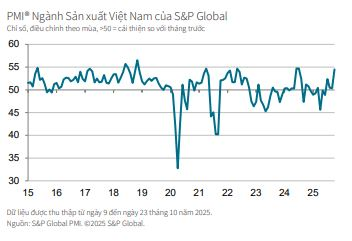 Chỉ số Nhà Quản trị Mua hàng - Purchasing Managers' Index™ (PMI®) ngành sản xuất Việt Nam của S&P Global đã tăng lên 54.5 điểm trong tháng 10, tăng đáng kể so với 50.4 điểm của tháng 9, cho thấy sức khỏe ngành sản xuất cải thiện mạnh mẽ so với tháng trước.