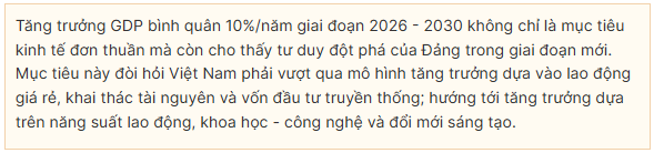 Để đạt được mục tiêu đến năm 2045, Việt Nam trở thành quốc gia hùng cường, thịnh vượng, hạnh phúc, việc tăng trưởng GDP bình quân 10%/năm giai đoạn 2026 - 2030 là một thách thức lớn nhưng hoàn toàn khả thi nếu chúng ta huy động được sức mạnh tổng hợp của toàn dân tộc, nhất là nguồn lực con người, khoa học - công nghệ và đổi mới sáng tạo. Điều quan trọng là cần duy trì tư duy đổi mới không ngừng, tinh thần dám nghĩ, dám làm, cùng với quyết tâm chính trị cao.
