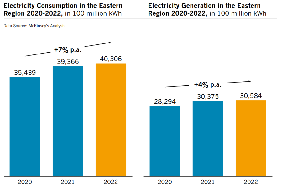 Nhu cầu điện năng ở khu vực phía Đông Trung Quốc vượt công suất phát điện, với tốc độ tăng nhu cầu 7%/năm so với tốc độ tăng nguồn cung chỉ đạt 4%/năm. Nguồn: McKinsey
