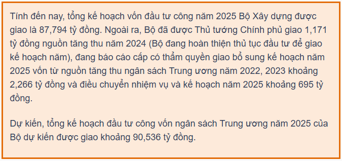 Tới hết tháng 10/2025, giá trị giải ngân của Bộ Xây dựng ước đạt 43,531 tỷ đồng, gồm khoảng 41,488 tỷ đồng các dự án do chủ đầu tư thuộc Bộ giải ngân và khoảng 2,043 tỷ đồng các dự án do chủ đầu tư thuộc địa phương quản lý giải ngân.