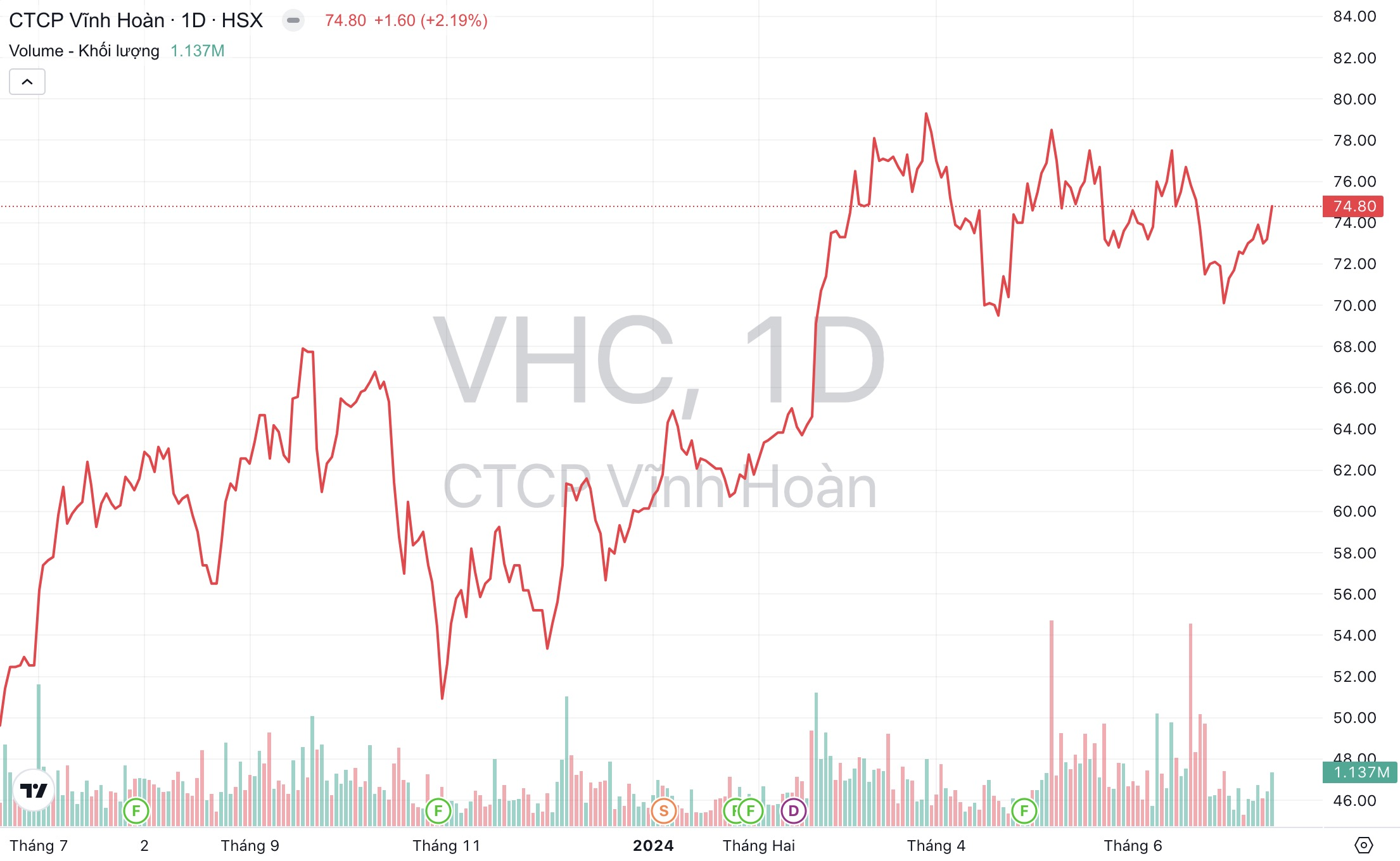 Khối lượng giao dịch và xu hướng giá cổ phiếu VHC của Thủy sản Vĩnh Hoàn trong vòng 12 tháng qua. (Nguồn: TradingView)