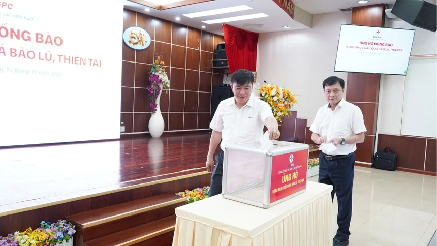Chủ tịch HĐTV EVNSPC Lê Văn Trang và Tổng giám đốc Nguyễn Phước Đức ủng hộ đồng bào khắc phục hậu quả bão lũ, thiên tai.