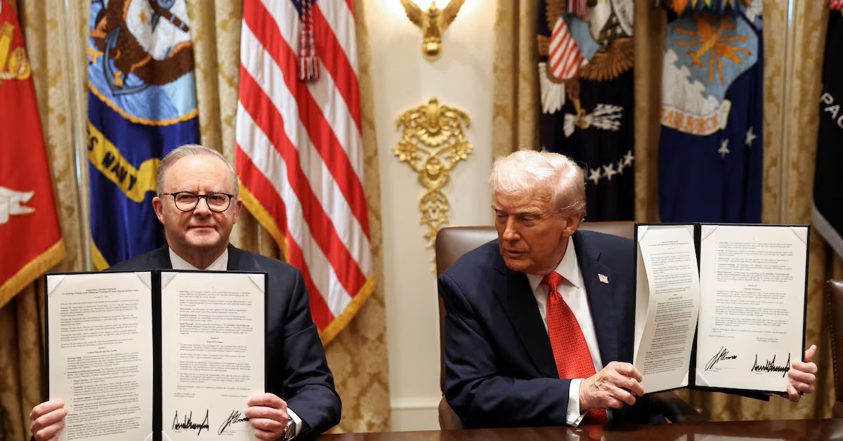 Thủ tướng Albanese và Tổng thống Trump ký kết thỏa thuận khoáng sản ngày 20.10 (theo giờ Washington) - Ảnh: Reuters