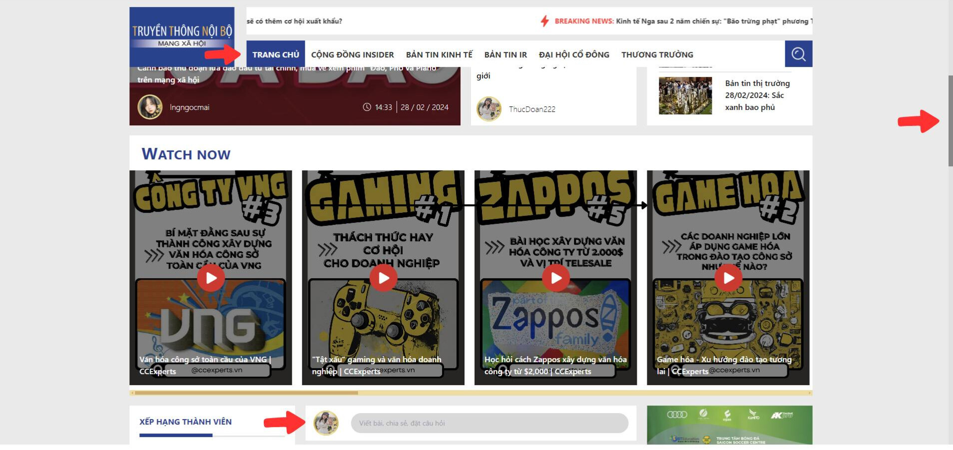 Bước 1: Click vào phần “Trang Chủ”, kéo thanh lăn bên phải màn hình, sau đó nhấp vào ô “Viết bài, chia sẻ, đặt câu hỏi”