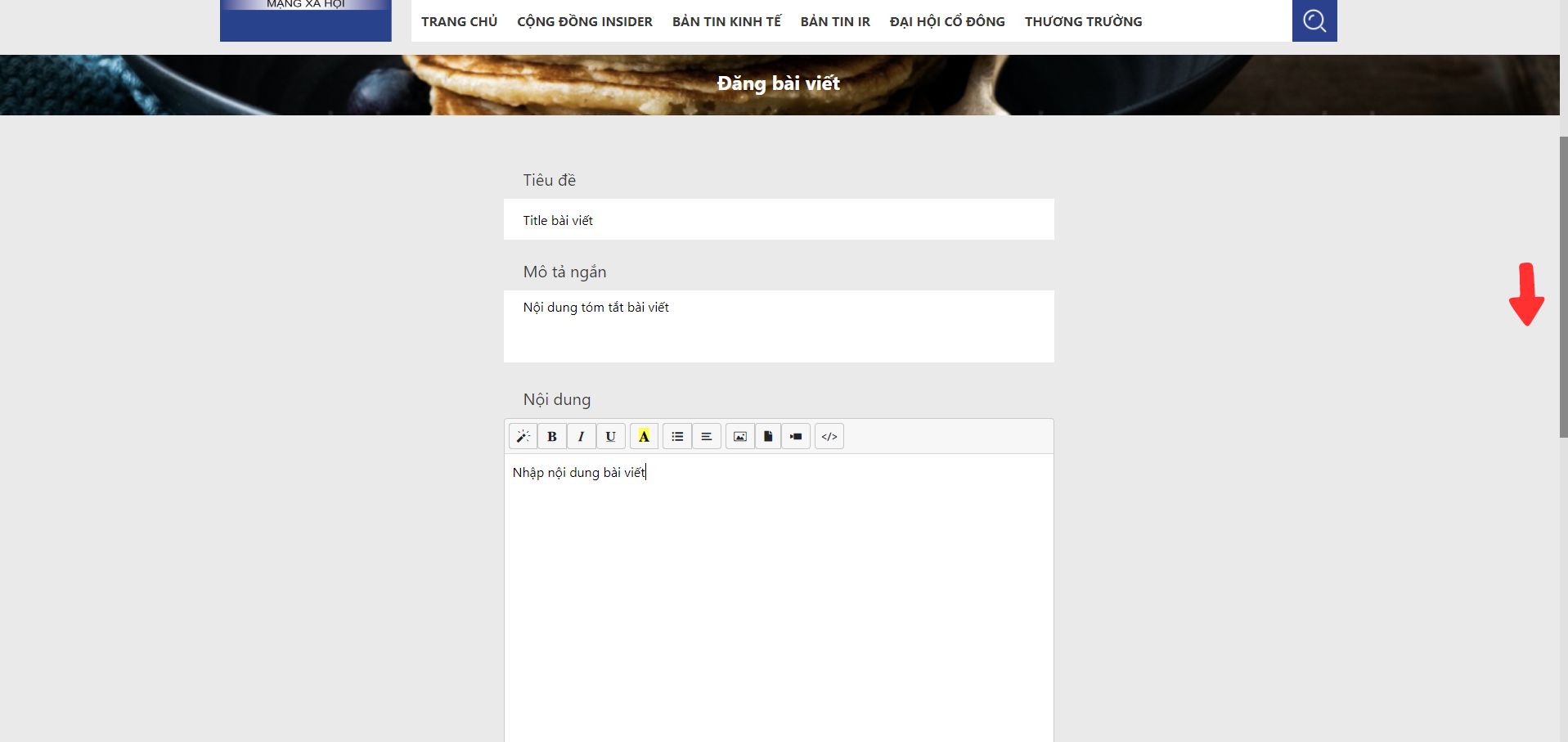 Bước 2: Nhập “Title” của bài viết vào ô “Tiêu đề”, ở phần “Mô tả ngắn” điền “Nội dung tóm tắt bài viết” hay còn gọi là phần Sapo (Lưu ý: phần mô tả ngắn không vượt quá 250 ký tự). Ở ô “Nội dung” nhập nội dung chi tiết bài viết + hình ảnh và chọn các thao tác xử lý văn bản ở các ô tương ứng trên thanh công cụ.