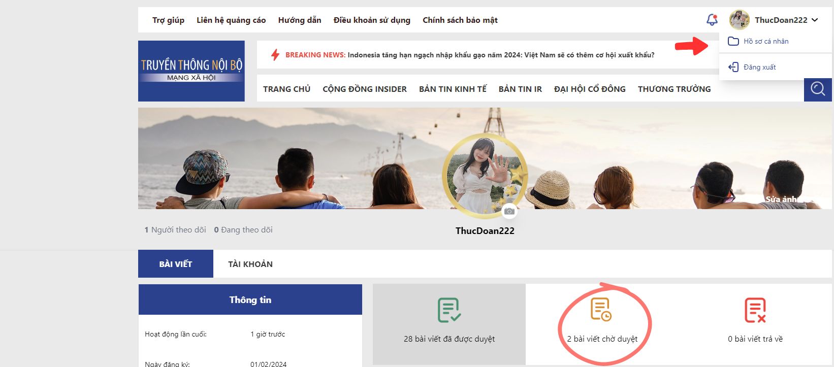 Bước 4: Chờ admin xét duyệt bài và xem thông tin tại phần Hồ sơ cá nhân.