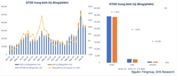 Sau khi tạo đỉnh trong tháng 8 - thể hiện tính chất đầu cơ khá đột biến, thanh khoản đã giảm tháng thứ 2 liên tiếp. Trong tháng 10, giá trị giao dịch trung bình toàn thị trường đạt hơn 36.800 tỷ đồng mỗi phiên, giảm hơn 2% so với tháng 9. Trên HoSE, giá trị giao dịch trung bình đạt hơn 33.600 tỷ đồng mỗi phiên với trung bình 1 tỷ cổ phiếu, giảm mạnh so trung bình 1,67 tỷ cổ phiếu mỗi phiên trong tháng 8.