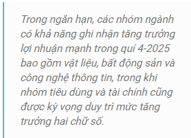 Trong các tháng cuối năm 2025, TTCK được kỳ vọng sẽ dần phản ánh triển vọng năm 2026, nhờ vào mục tiêu tăng trưởng GDP 10% của Chính phủ, cùng với các biện pháp kích cầu tiêu dùng tiếp tục được triển khai. Những yếu tố vĩ mô tích cực này tạo nền tảng vững chắc cho đà tăng trưởng kinh tế và củng cố niềm tin của nhà đầu tư. Trong ngắn hạn, các nhóm ngành có khả năng ghi nhận tăng trưởng lợi nhuận mạnh trong quí 4-2025 bao gồm vật liệu, bất động sản và công nghệ thông tin, trong khi nhóm tiêu dùng và tài chính cũng được kỳ vọng duy trì mức tăng trưởng hai chữ số.