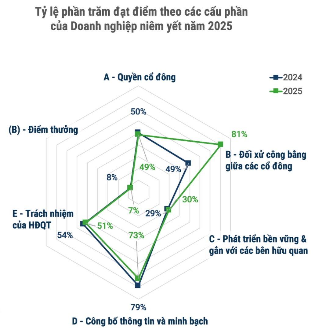 Điểm chất lượng quản trị công ty năm 2025 của các công ty niêm yết Việt Nam gia tăng đáng kể so với năm 2024. Nguồn: VIOD