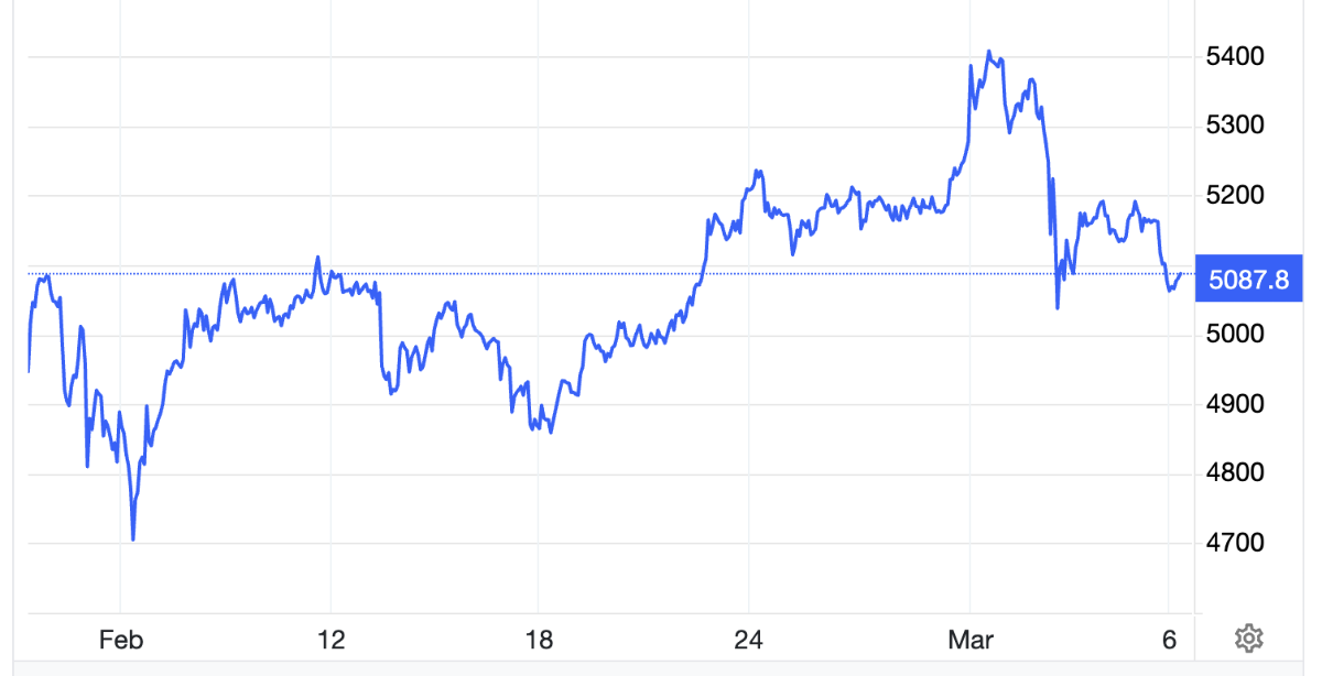 Vào đầu cuộc xung đột, giá vàng có lúc vượt mốc 5.400 USD/oz trong phiên ngày thứ Hai tuần này nhờ nhu cầu trú ẩn an toàn, nhưng sau đó không giữ được vùng giá này. Kỷ lục mọi thời đại của giá vàng là mốc gần 5.600 USD/oz thiết lập vào hôm 29/1.